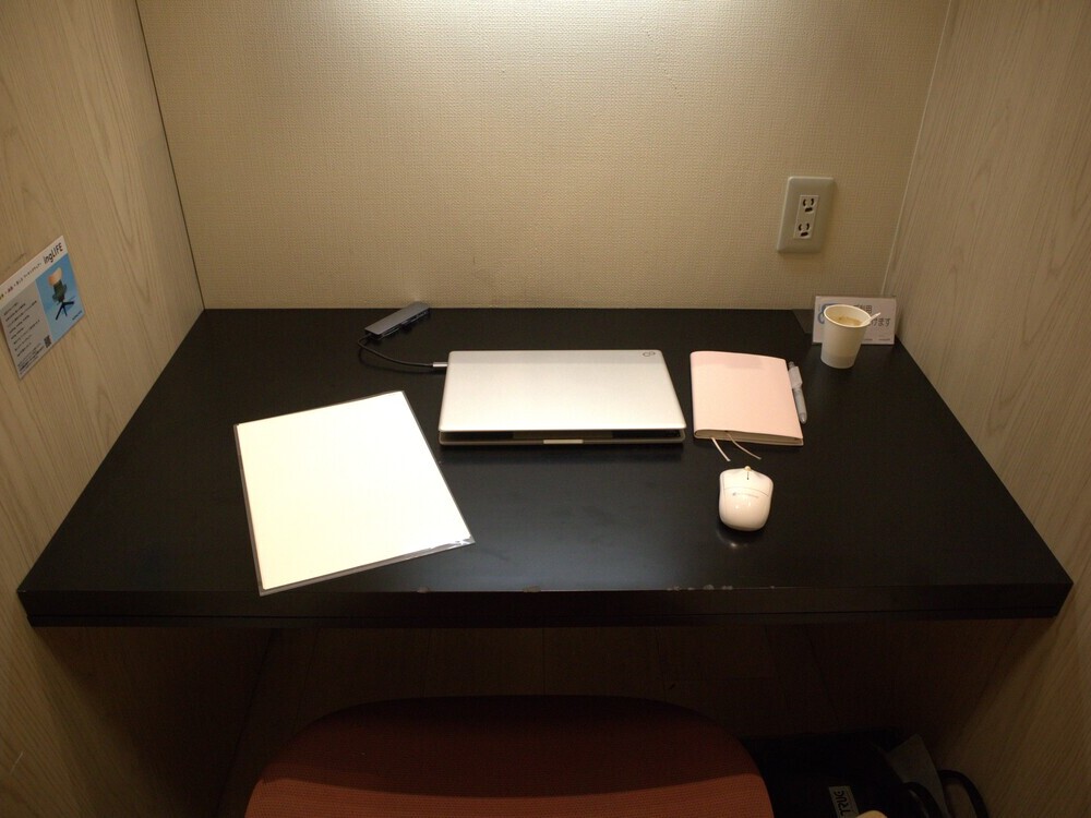 さあ、仕事開始です。フリードリンク、パソコン(14インチ)、マウス、資料(A4)、手帳を置いてもこの広さ!捗りそうな予感がします。