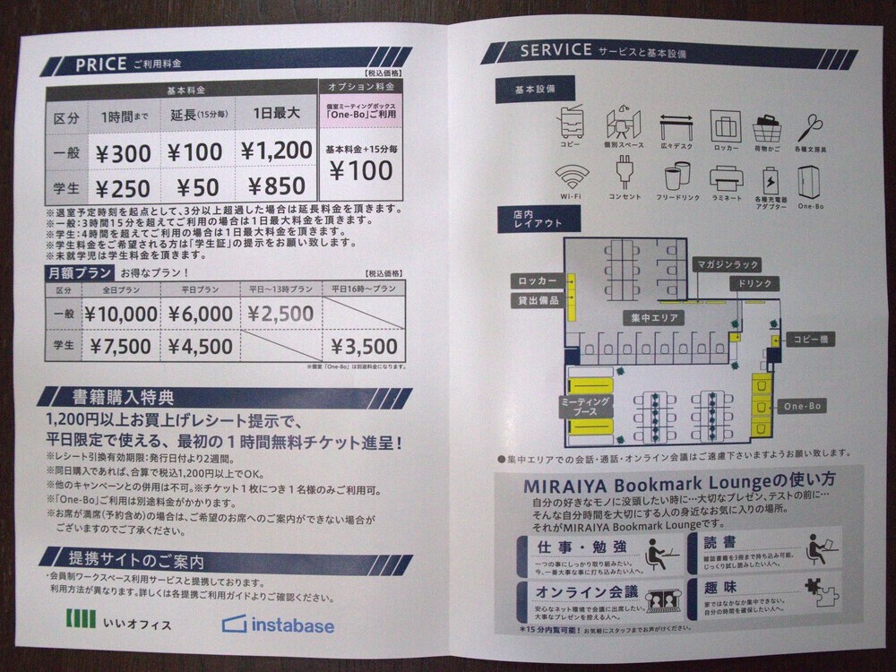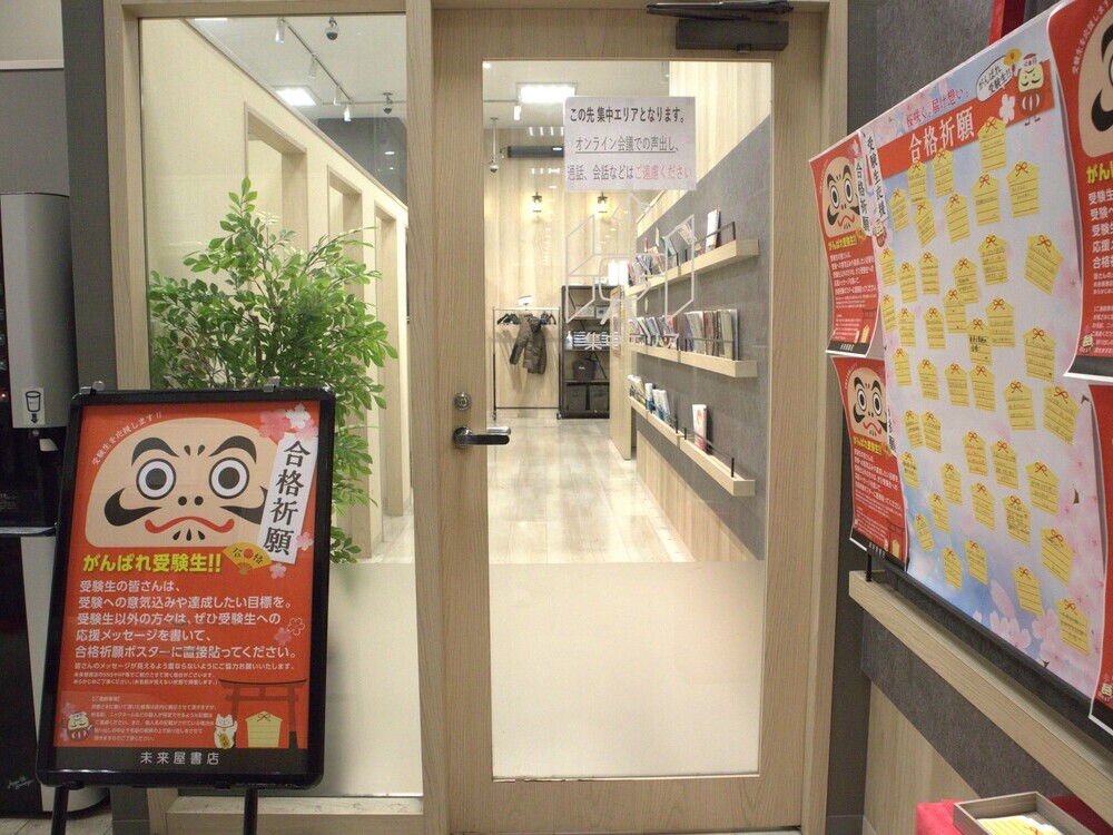 また、隣接する未来屋書店内の雑誌書籍を3冊まで持ち込み試し読みできたり、1200円以上の書籍購入レシートを提示すれば平日限定の1時間無料チケットがもらえたり(引き換え有効期限:発行日より2週間)といった、書店隣接ならではのサービスもあります。