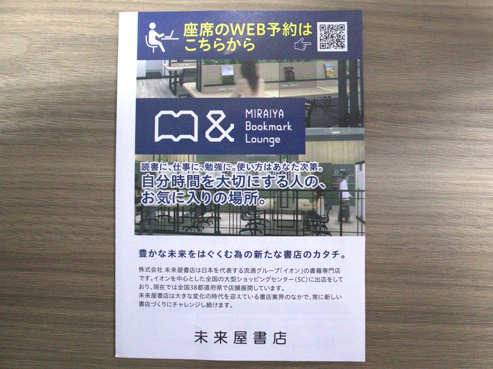 MIRAIYA Bookmark Lounge 八千代緑が丘店は、イオン八千代緑が丘店3階にある未来屋書店に隣接するコワーキングスペースです。