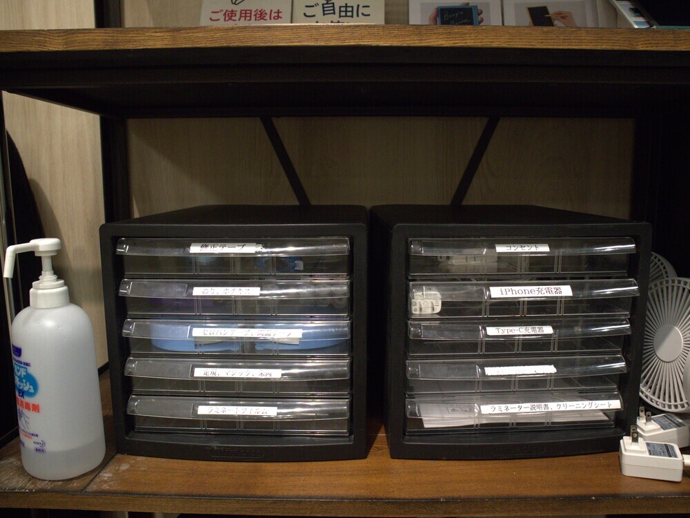 こちらは、貸出の備品。修正テープ・のり・ホチキスなどの文房具、パソコンやスマホに使用できるコンセントや充電器などもありました。うっかり忘れて来てしまっても安心ですね。