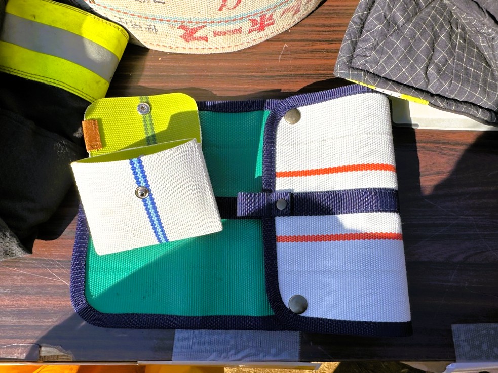 消防服や消防ホースの難燃性や耐久性を活かした財布やコインケースも実際に手に取ることができます。