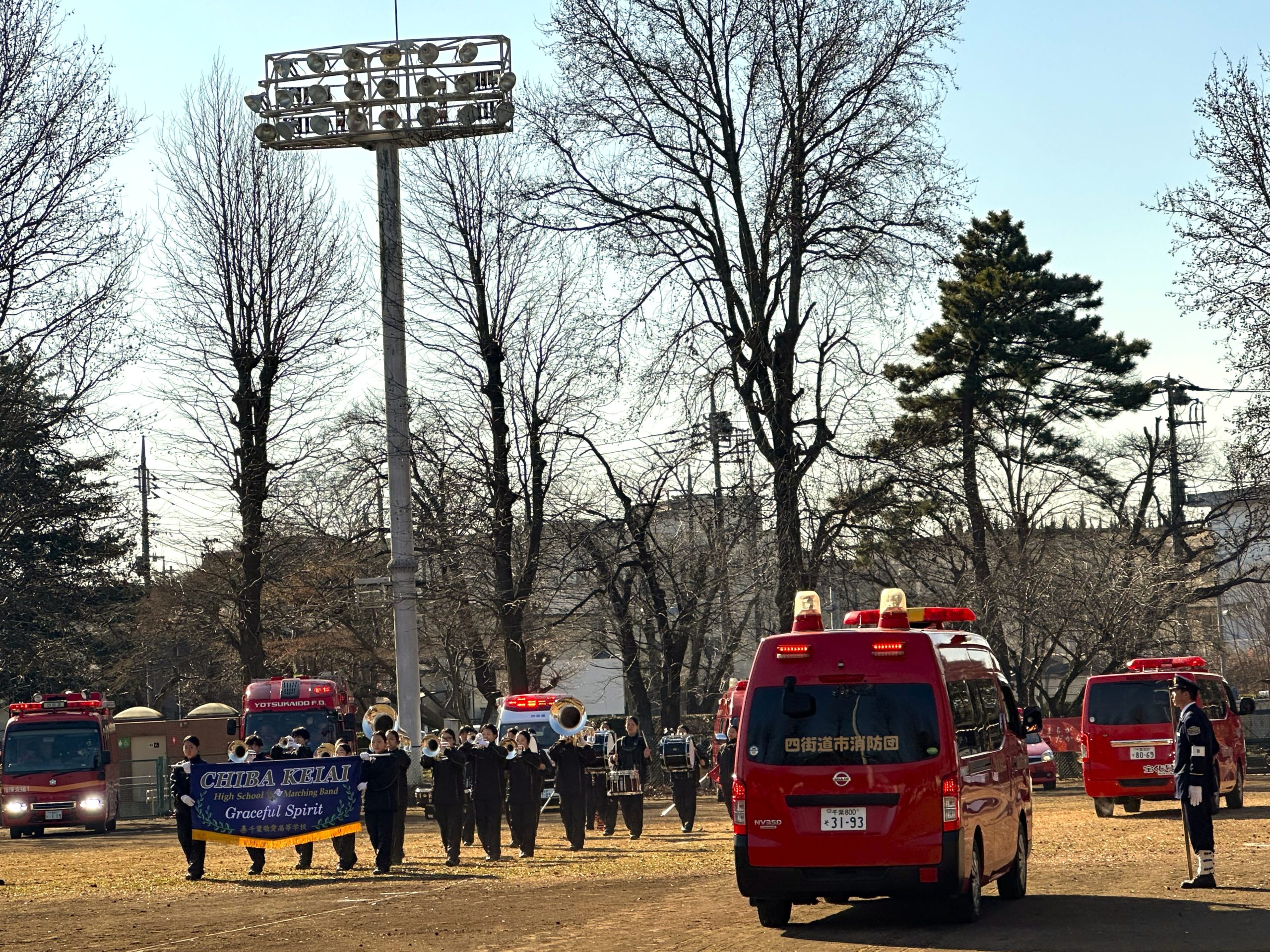 千葉敬愛高等学校マーチングバンド部の先導で、消防車両が野球場内を行進しました。