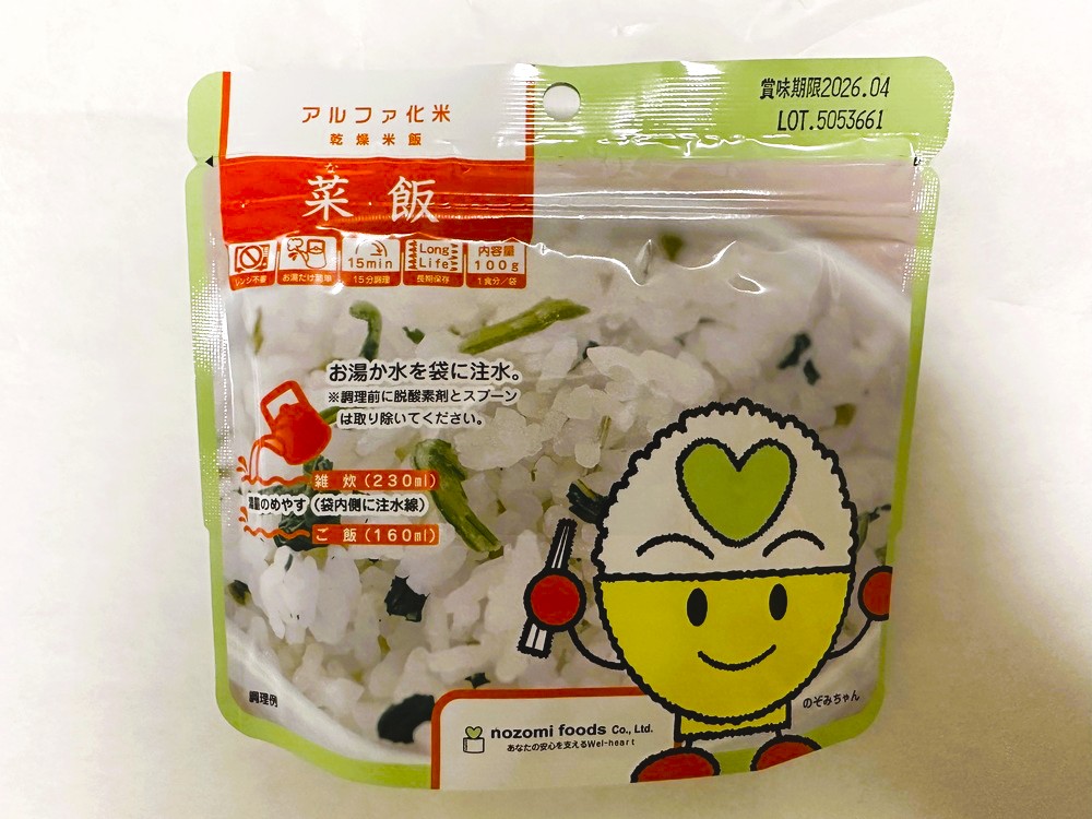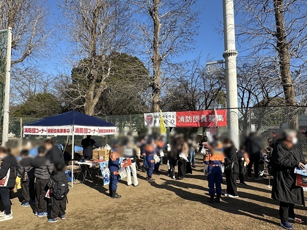 消防団員を募集するブースでは、防災意識を高めるきっかけとして、家庭での備えにも役立つアルファ化米の非常食が配布されていました。
