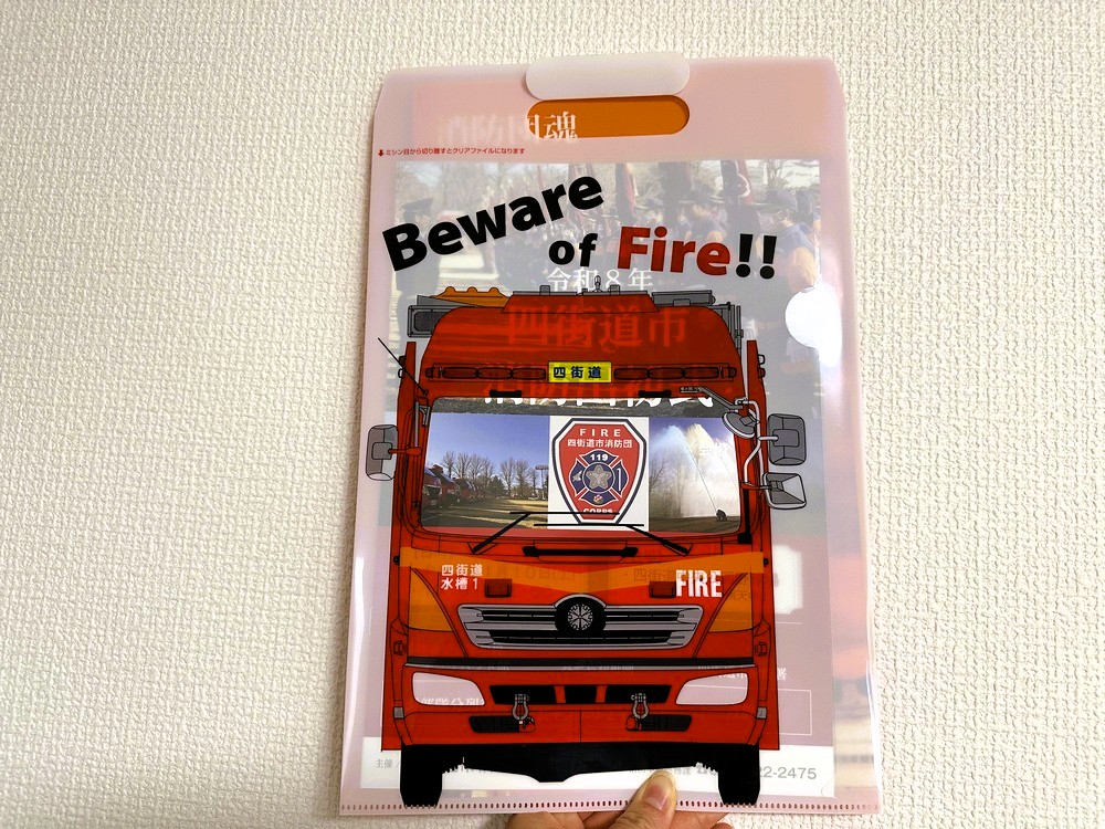 また、消防車のイラストが描かれたクリアファイルバックも配布しており、中には出初式や消防団員募集の冊子、下敷きが入っています。