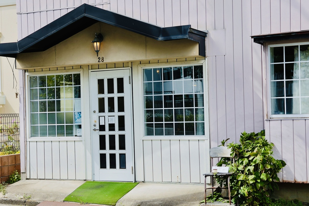 ピンクでなんともかわいらしい外観のニハチ喫茶さん。ランプ下にはお店の名前を記した、28の数字。