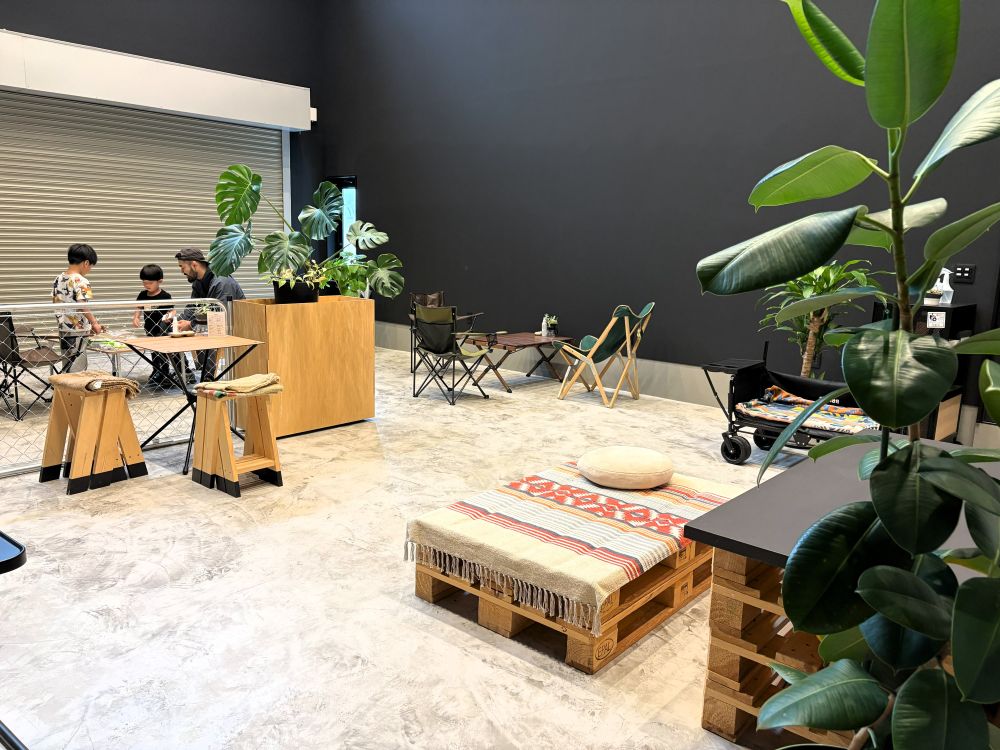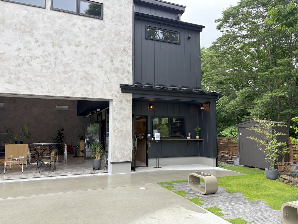 ガレージがカフェスペースになっていて、テーブルやイスもそれぞれ個性のある家具が並びます。さまざまな本や塗り絵、UNOやカルタなどのちょっとしたゲームも置いてあり、まるで誰かの家に遊びに来たような安心感。