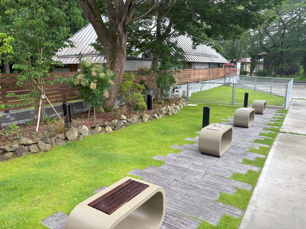 この日はあいにくの雨でしたが、広々とした敷地にはこちらもおしゃれなベンチが置かれています。