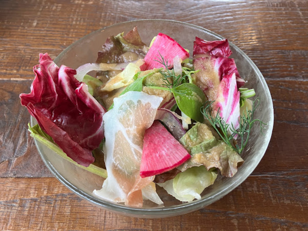 紫キャベツや紫大根が入ったカラフルなサラダには、生ハムも入っていて見た目にも楽しい!