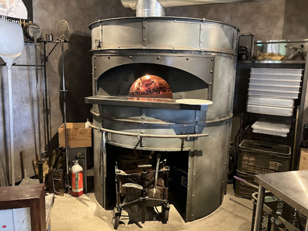 店内入口にある巨大な薪窯で焼き上げるピザは、2024年7月の提供開始から大人気。