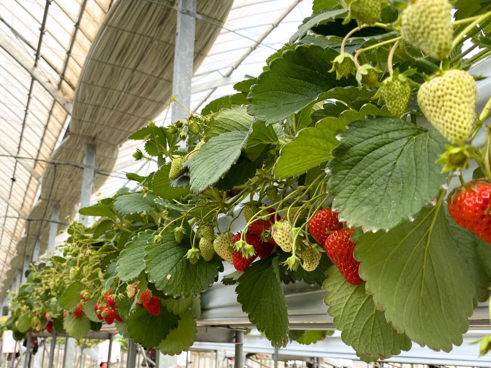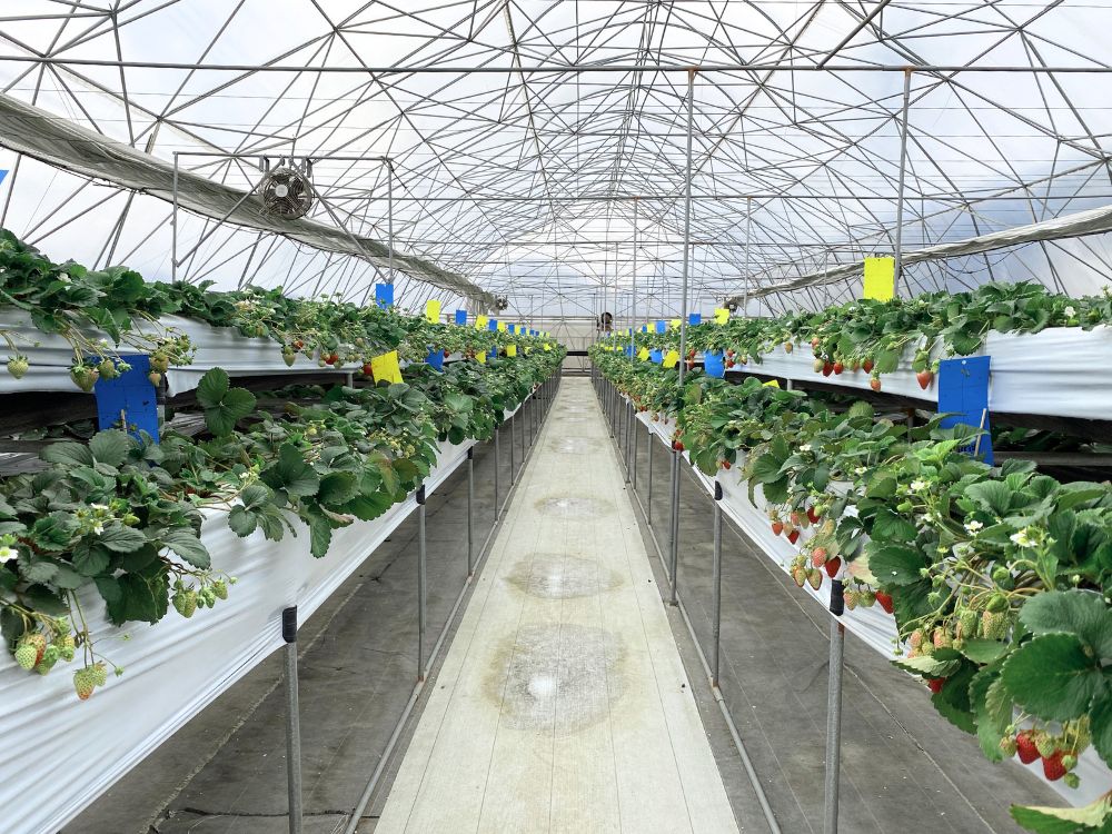 2020年10月に完成したシエルファームは、立ったまま摘める「高設栽培」が特徴です。腰をかがめず無理な姿勢にならないため、子どもから大人までいちご狩りを満喫できます。
