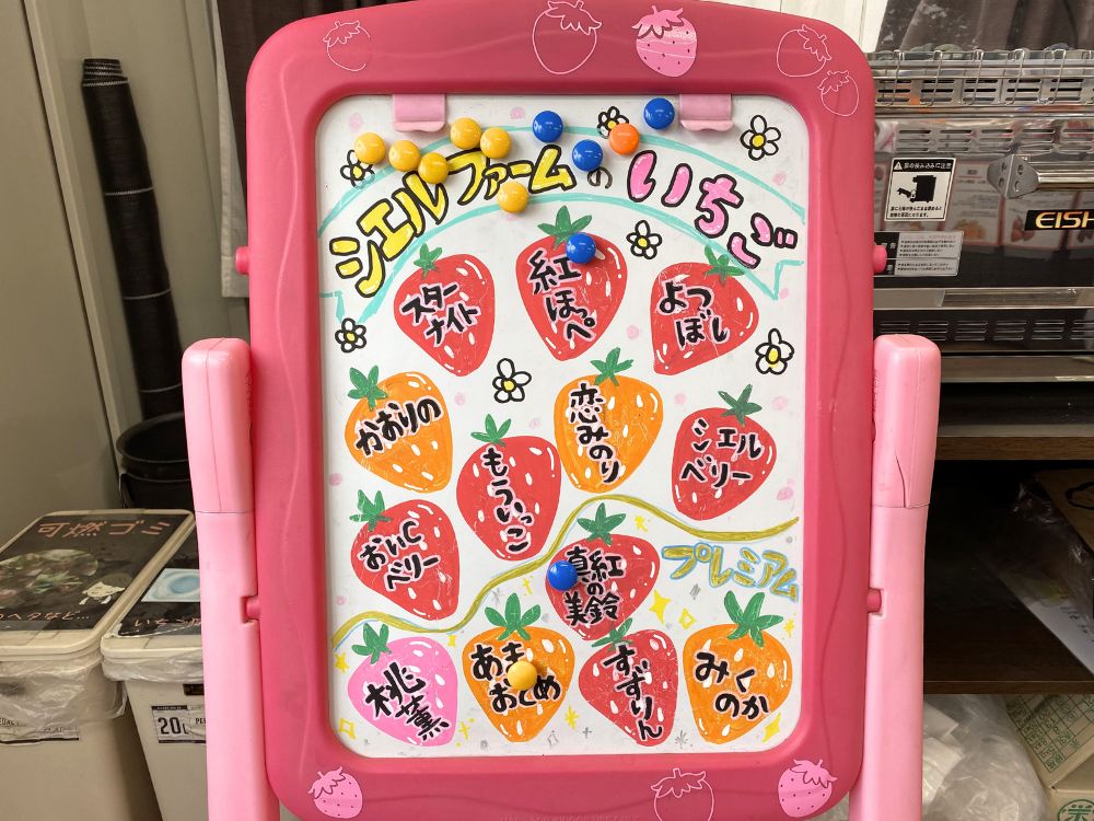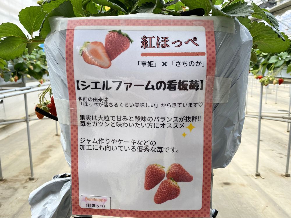 いちごの品種は紅ほっぺ・スターナイト・よつぼし・かおり野・恋みのり・もういっこ・おいCベリー・シエルベリーのほかに、真紅の美鈴(黒いちご)など13種類栽培しています。