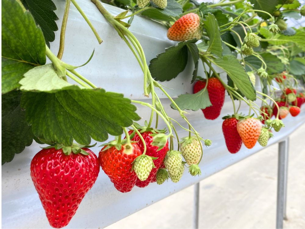 13品種のいちごと摘み取りやすい高設栽培