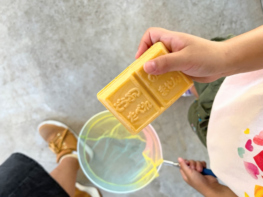おいしそうなモナカを半分に割ると、中には丸い形のえさが入っています。