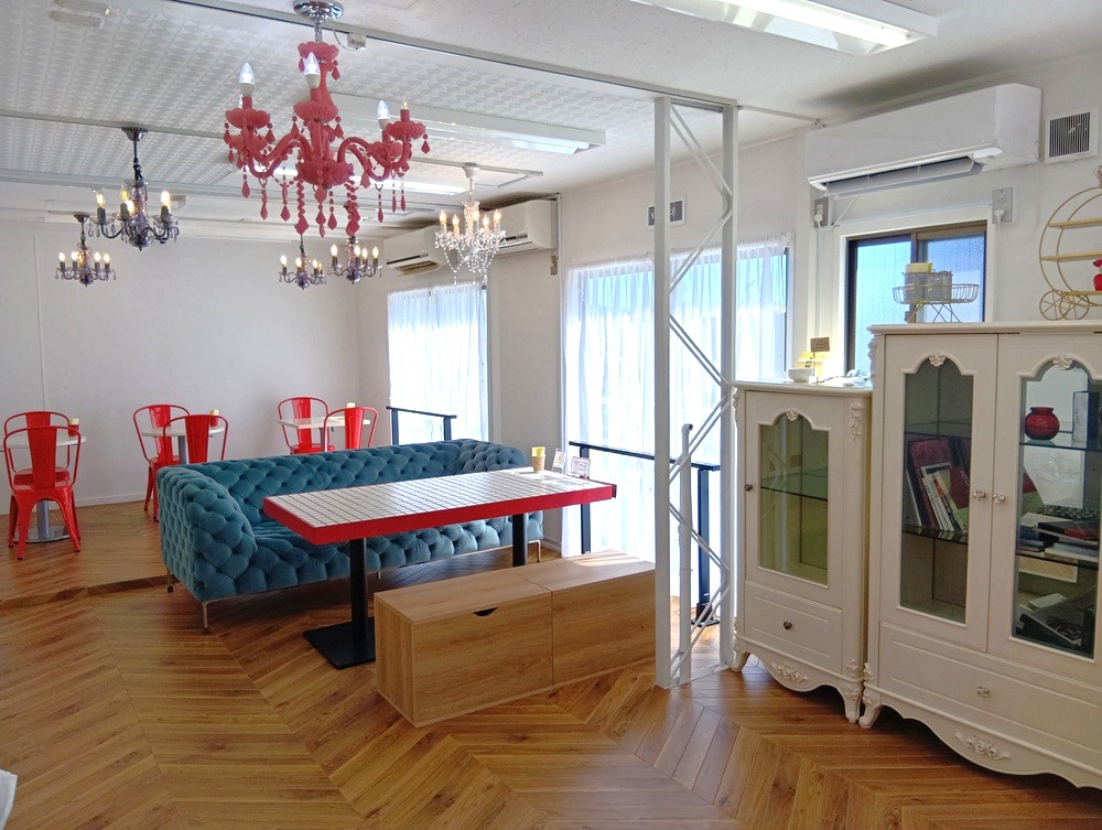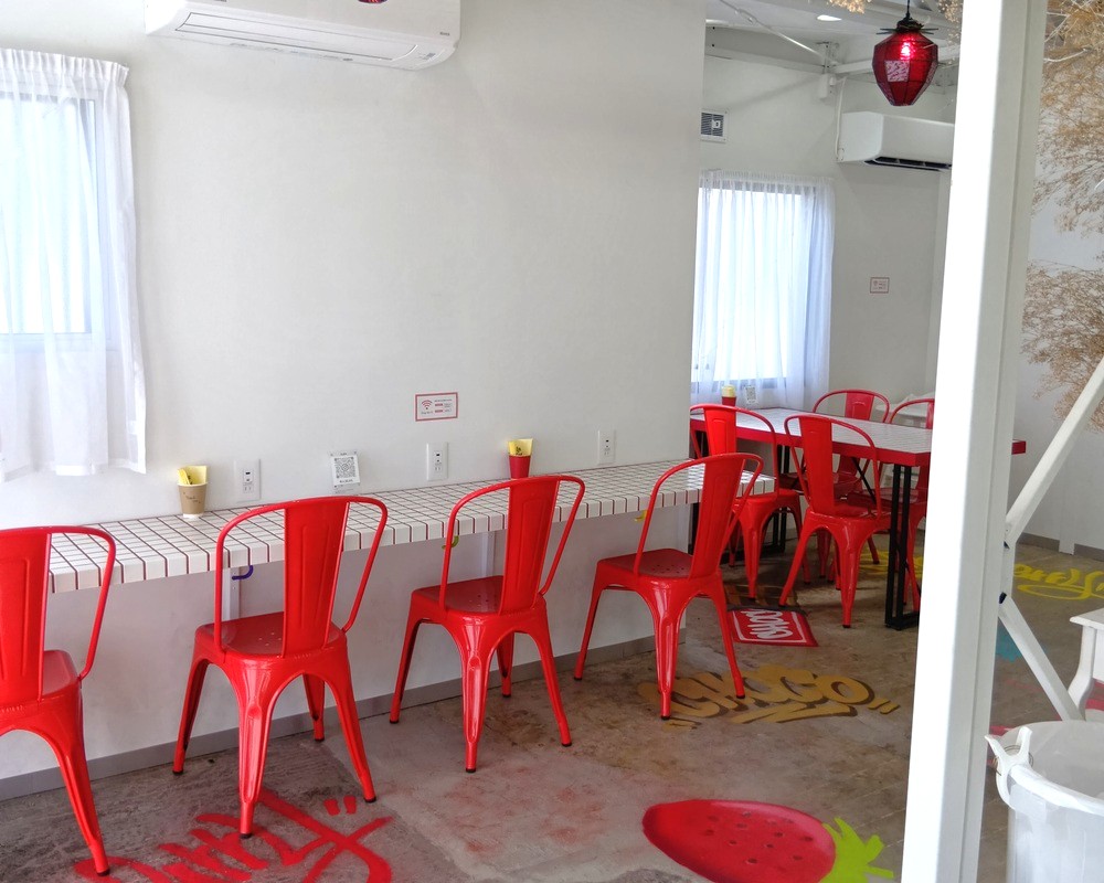 店内は白い壁を基調に、赤い椅子や木目調のオシャレな家具が並ぶスタイリッシュな空間。ナチュラルで清潔感がありながらも、どこか温かみを感じられるインテリアになっています。大きな窓から光が差し込むので、昼間は特に明るく開放的な雰囲気です。