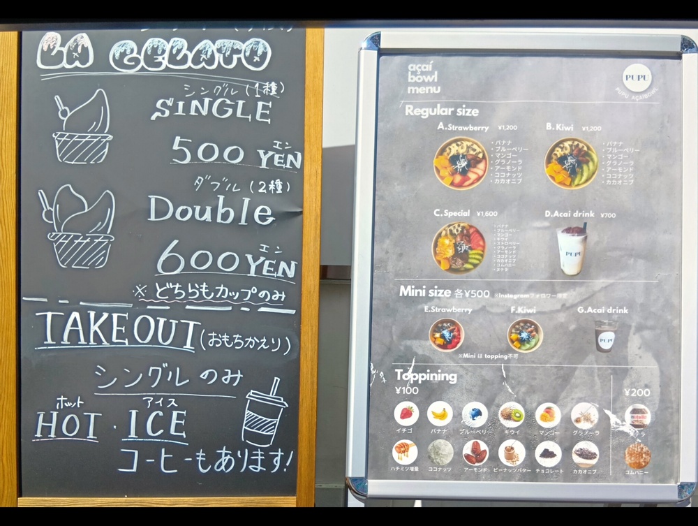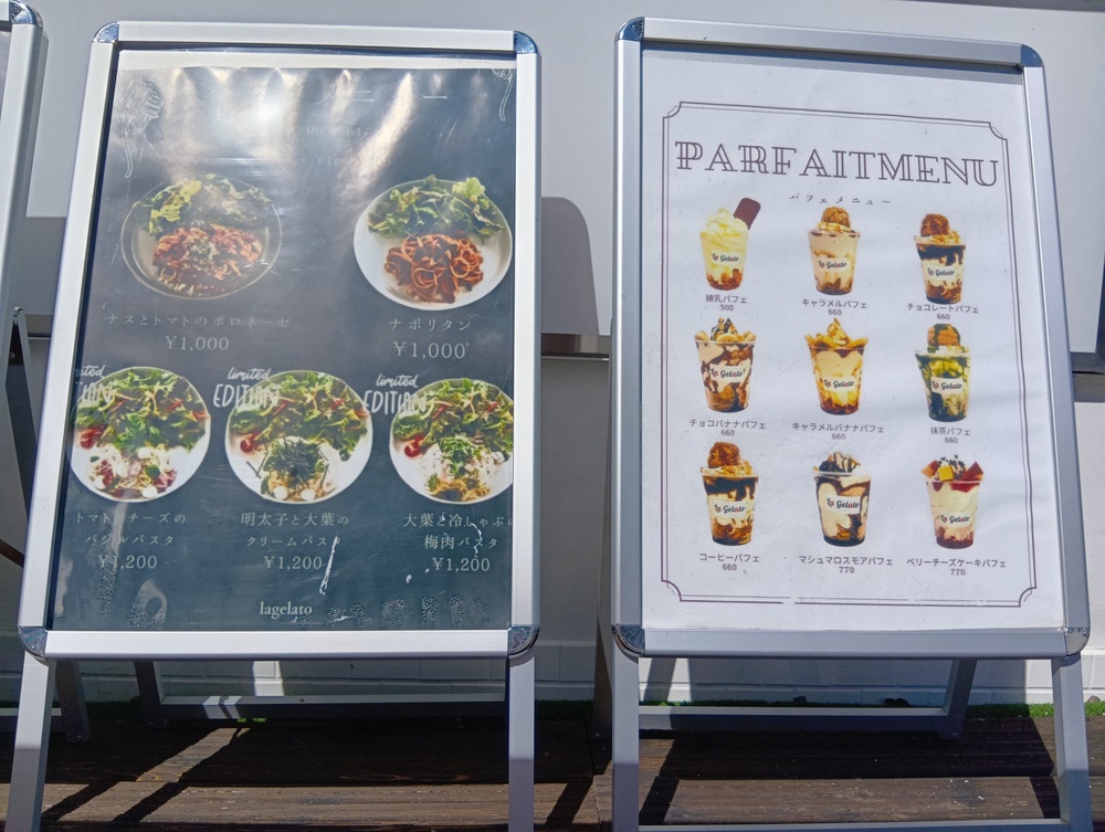 「La gelato」はジェラートだけでなく、スイーツや軽食メニューも楽しめます。アサイーボウルやパフェといったスイーツ系のほか、ランチやディナーにも利用できるパスタメニューまで揃っているのは驚きです。