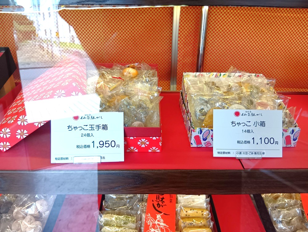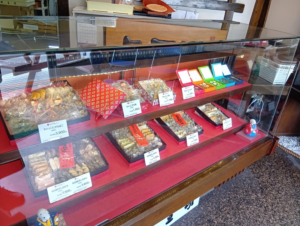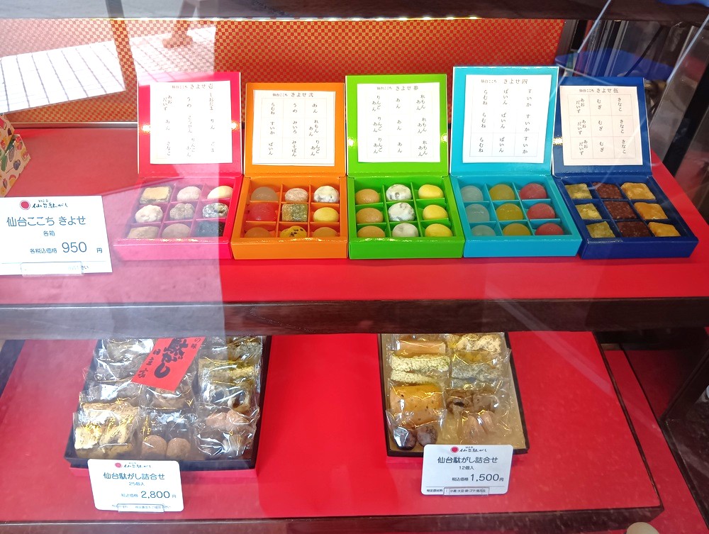 正面のショーケースには、伝統的な「仙台駄菓子」が並びます。仙台駄菓子は個数によって値段が異なり、14個入り1,100円〜60個入り7,700円の商品まで種類豊富にラインナップ。自分用のおやつはもちろん、お土産や贈答品にも最適ですね♪