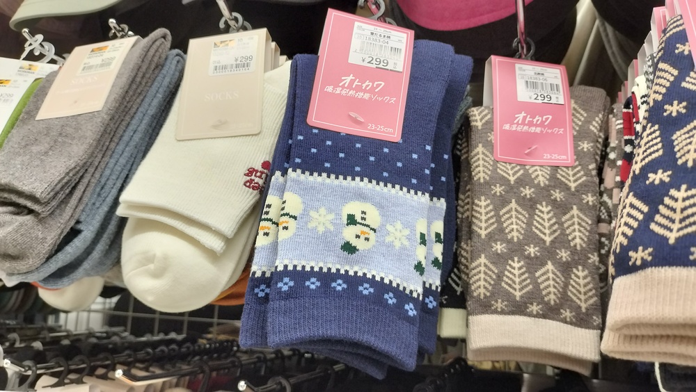 雪だるま柄のもの、かかとが厚手のもの、登山にも使えそうな高機能ソックスまで勢ぞろい。